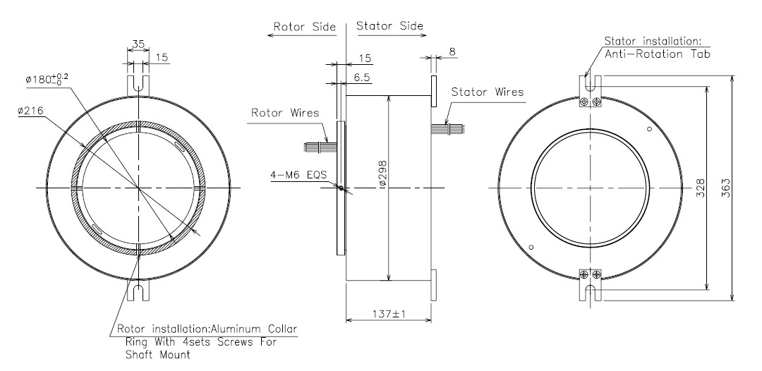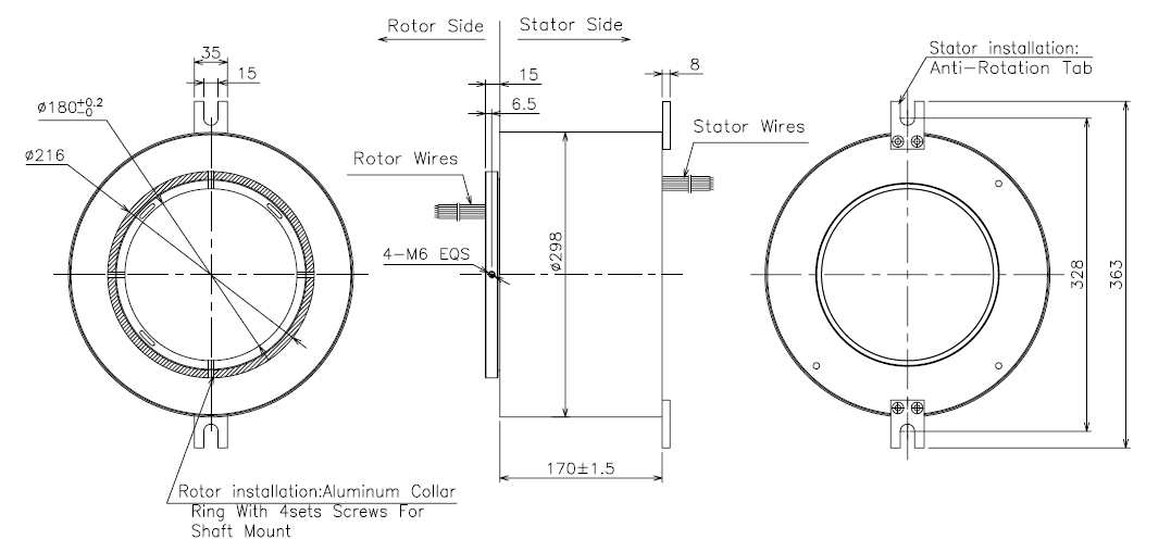 Bague collectrice à trou traversant standard LPT-180, le diamètre intérieur est de 180 mm, le diamètre extérieur est de 298 mm, 6 canaux * 5A, le trou traversant sans obstacle de 180 mm fournit un espace de câblage pour l'installation d'un arbre hydraulique, pneumatique ou coaxial.Contactez-nous