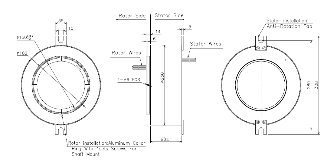 Bague collectrice à trou traversant standard LPT-150, le diamètre intérieur est de 150 mm, le diamètre extérieur est de 250 mm, 6 canaux * 5A, le trou traversant sans obstacle de 150 mm fournit un espace de câblage pour l'installation d'un arbre hydraulique, pneumatique ou coaxial.Contactez-nous
