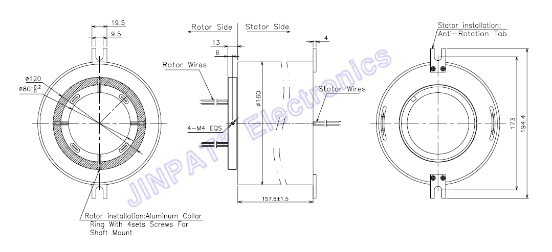 Bague collectrice à trou traversant standard LPT-080, le diamètre intérieur est de 80 mm, le diamètre extérieur est de 160 mm, 6 canaux * 5A, le trou traversant sans obstacle de 80 mm fournit un espace de câblage pour l'installation d'un arbre hydraulique, pneumatique ou coaxial.Contactez-nous