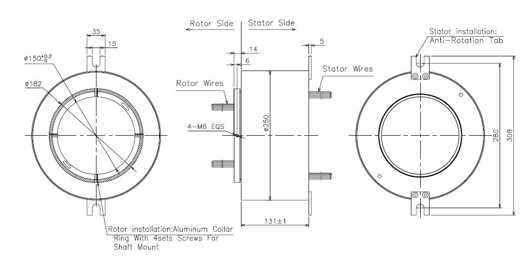 Bague collectrice à trou traversant standard LPT-150, le diamètre intérieur est de 150 mm, le diamètre extérieur est de 250 mm, 6 canaux * 5A, le trou traversant sans obstacle de 150 mm fournit un espace de câblage pour l'installation d'un arbre hydraulique, pneumatique ou coaxial.Contactez-nous